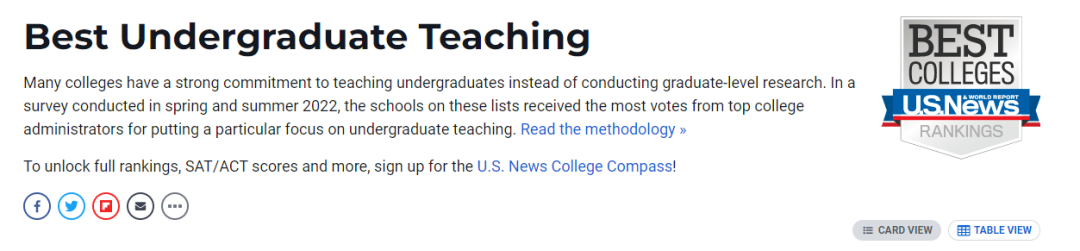 本科教育排名关注的是致力于以高质量的方式教授本科学生的美国大学,参与了U.S. News年度同行评估调查的大学校长、教务老师和招生主任需要在全美大学排名中提名15所在本科阶段教学方面占有绝对优势的学校。官方汇总此排名的意义:是要与普遍的大学综合排名区分开来,因为学生在本科阶段所感受到的教学体验是非常重要的。最佳本科教育排名可以帮助学生了解一所学校的课程教学质量,首先,该排名上榜的学校全部来源于教育专业人士的评价,是美国最懂教育的专家们认可的学校;其次,只有得到校长、教务长和招生主任的7个及以上提名,才有资格上榜。能让同行都对你认可,可见实力毋庸置疑!对于未来赴美读本科的学生有很强的参考价值哦!