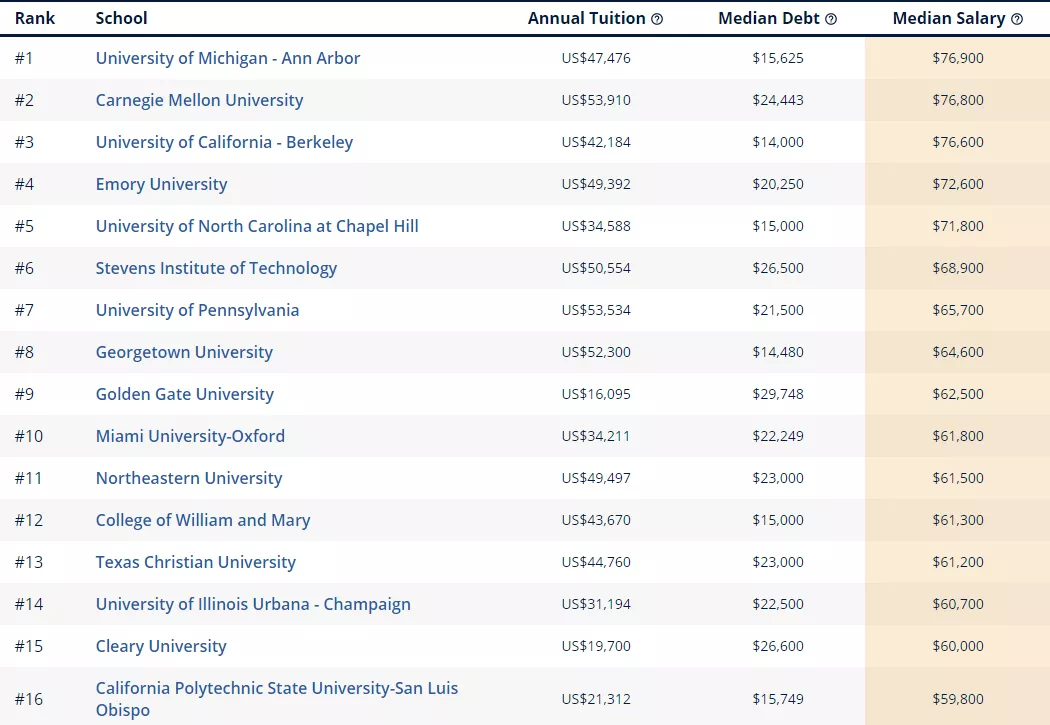 可以看到,很多综合排名一般的学校在某些专业就业方面甚至比那些顶尖学校表现还要好。而同一所学校不同专业毕业生的起薪也相差不少。所以,想要毕业后拿到不错的起薪,专业和学校的确定都至关重要!