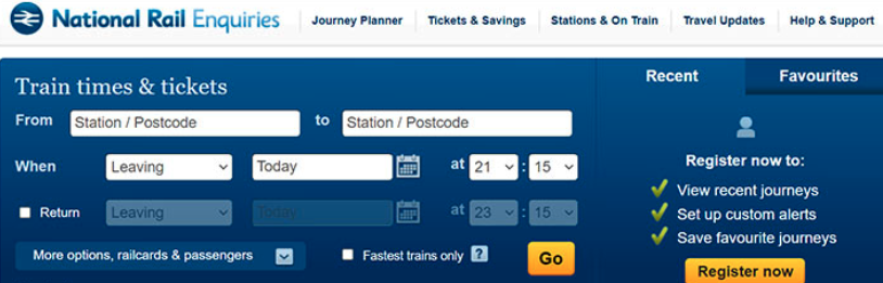 网上坐火车的攻略层出不穷,推荐的搜票定行程的网站也各不相同。在这里,还是推荐大家直接去National Rail或者Trainline,免得遇到其它钓鱼网站。下面咱以National Rail为例,进入主页之后,大家就可以看到搜索页面了: